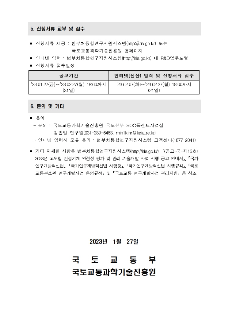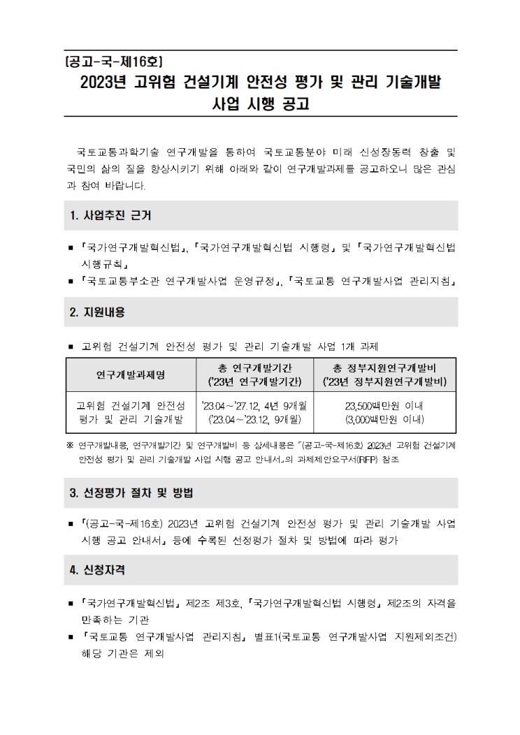 (공고-국-제16호) 2023년 고위험 건설기계 안전성 평가 및 관리 기술개발 사업 시행 공고