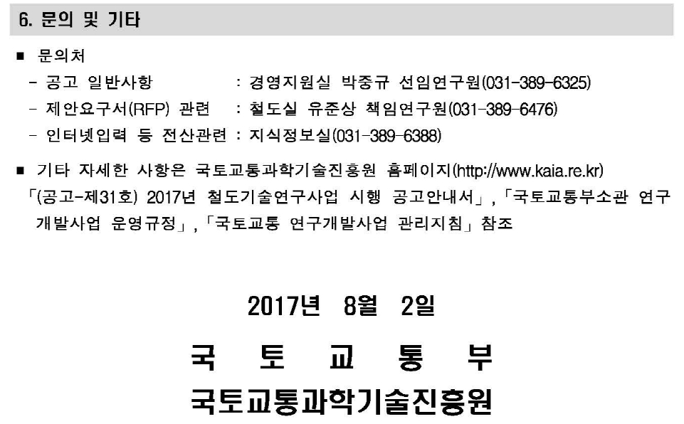첨부파일 : 붙임1_공고 제31호_2017년 철도기술연구사업 시행 공고문.hwp 붙임2_공고 제31호_2017년 철도기술연구사업 시행 공고안내서.hwp 붙임3_기획연구보고서.pdf 붙임4_참고자료 작성서식.zip