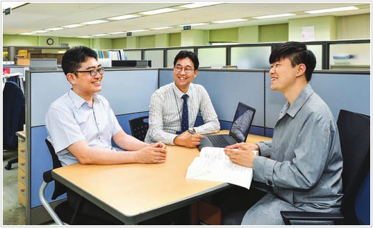 똑 부러지는 카리스마와 부드러운 리더십의 황수현 그룹장을 비롯해 경청의 자세로 소통하는 이화진 책임연구원과 결정적 순간에 신의 한 수를 제공해 현자(賢者)로 통하는 정진도 책임연구원의 조화가 빛을 발하는 이곳은 한마디로 최상의 합을 가진 부서다. 흥미롭게도 남녀 간 궁합조차 안 본다는 네 살 터울로, 이해하고 도와가며 우수한 성과를 낼 수 있도록 굳건한 팀워크를 유지하고 있다고.